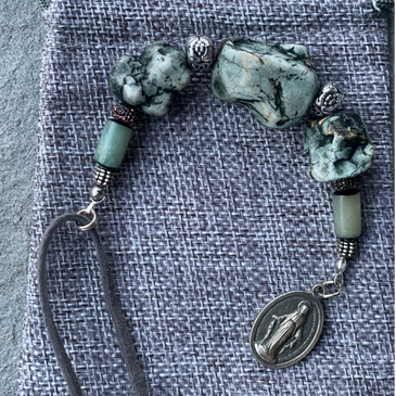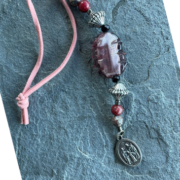 Culminating at the end of each tag is a new or antique religious medal of a prominent Catholic saint, the Blessed Mother, the Holy Family or the Lord himself.